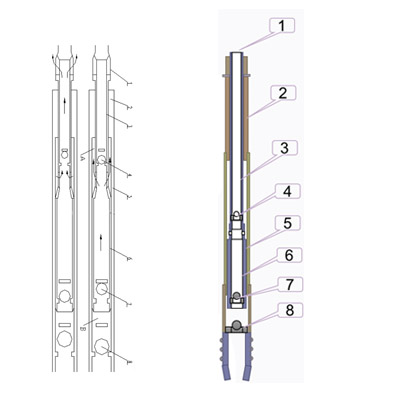 При ходе вниз плунжер опускается, объем камеры B уменьшается, давление увеличивается, объем камеры A увеличивается, давление уменьшается. Под действием разности давлений между камерами А и В нижний нагнетательный клапан 7 быстро открывается, и нефтегазовая смесь из камеры В поступает в камеру А. Поскольку кольцевая площадь нижней рабочей камеры В больше, чем у верхней рабочей камеры А, то при попадании всей нефти и газа большего объема из нижней рабочей камеры В в верхнюю рабочую камеру А меньшего объема произойдет сжатие нефтегазового объема (по сути, сжатие газа) и повышение давления.